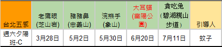 * 戶外課朝日班為上午10點,夕陽班為下午2點,紅字為夜間課,晚上6點上課。