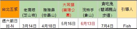 * 戶外課朝日班為上午10點,夕陽班為下午2點,紅字為夜間課,晚上6點上課。